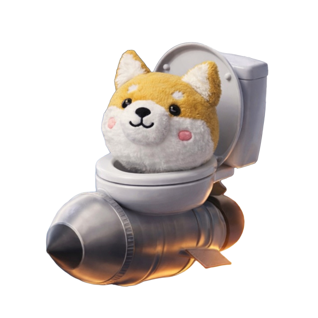 $Toiloid – Shiba on the Throne! Meet Toiloid, the hilarious new variant of Liv Perrotto’s iconic Asteroid Shiba Inu! This plush sky-blue astronaut pup has traded zero-gravity space adventures for the ultimate cosmic bathroom break. Still rocking the fuzzy onesie and “ASTEROID” chest patch, he’s now proudly seated on a high-tech toilet, tail wagging, with a plunger handle and toilet-paper rocket trail blasting behind him.
